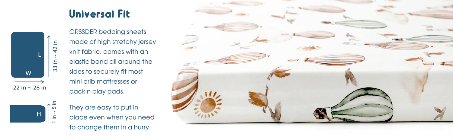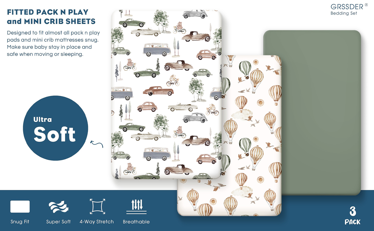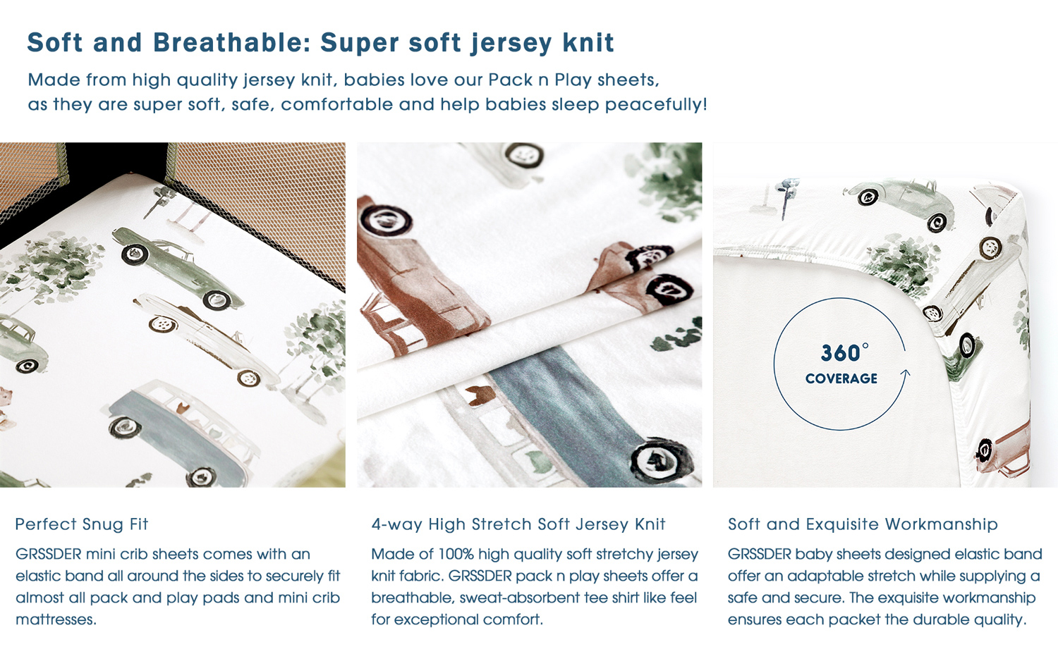 GRSSDER Pack n Play Sheets Fitted 3 Pack, Stretchy Ultra Soft Jersey Knit Pack and Play Sheets, Universal Fitted Portable/Mini Crib Mattresses Snug and Safe, Neutral Pattern of Cars Print | Pack and Play Sheets, Ultra Soft, Stretchy