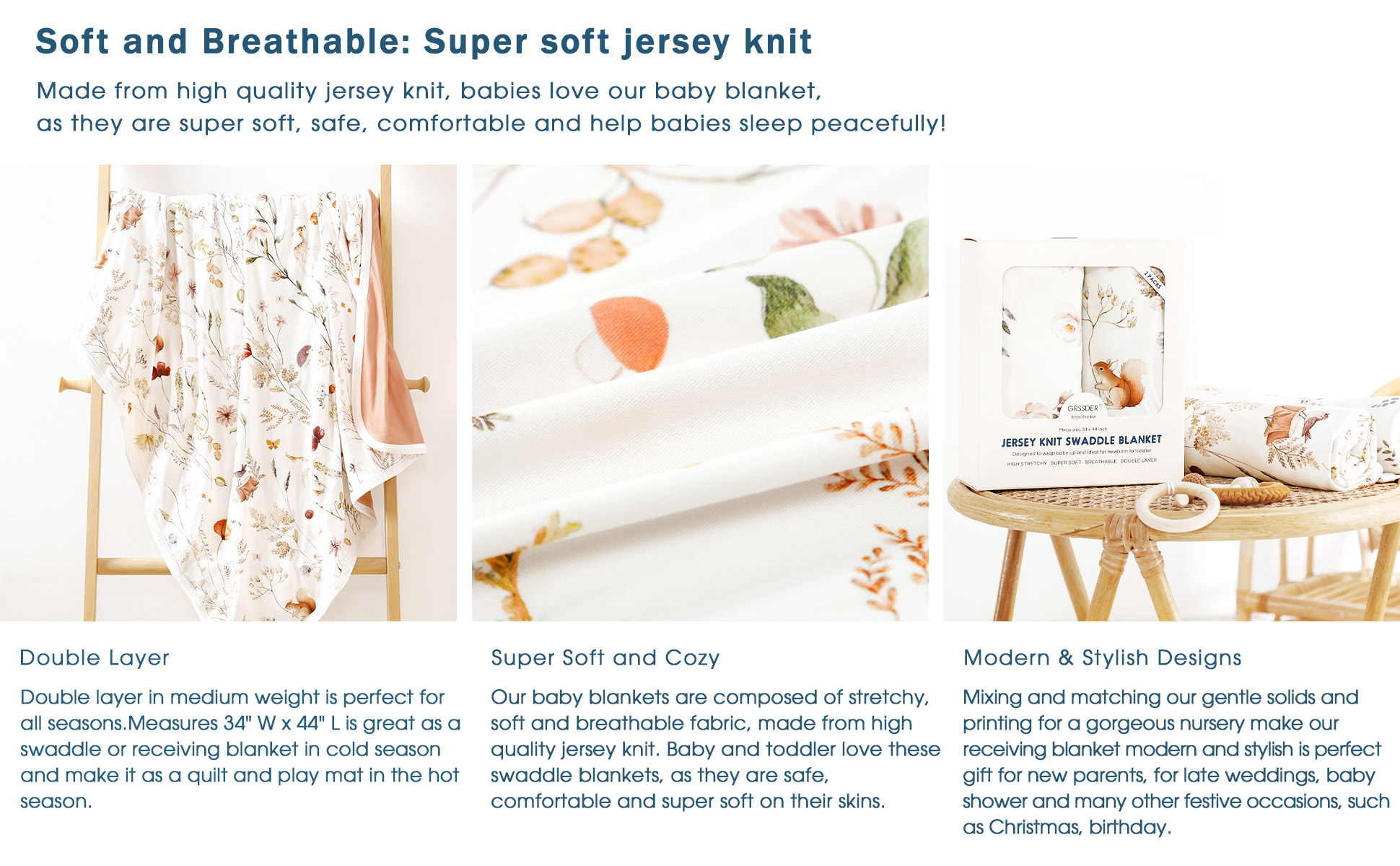 GRSSDER Baby Swaddle Blanket 2 Pack, Super Soft Jersey Knit Quilt Blankets for Baby Girls, Reversible Double Layer Receiving Blankets 34 x 44 Extra Large for Swaddling,